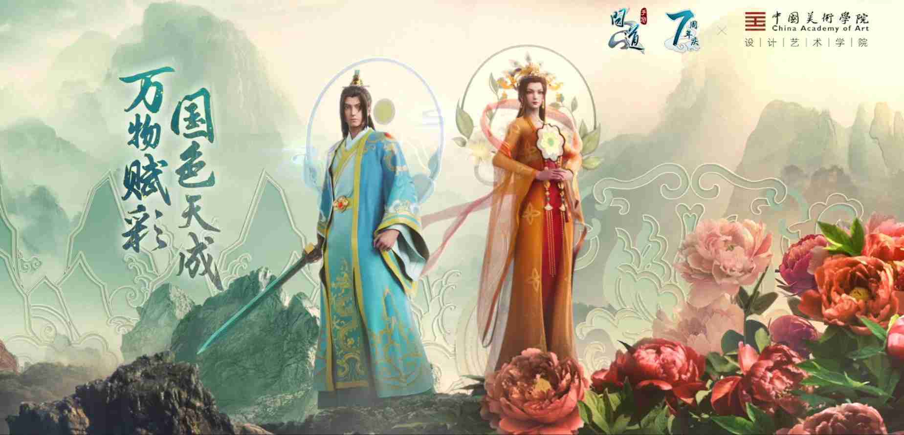 2023年4月,,,《问道手游》联动中国美术学院,,,,在游戏中融合了中国历史上不同时期的文化元素,,,打造了“山河万象”与“凤鸣九霄”的国风时装。。在色彩配置方面,,,,创作团队基于对游戏角色特性的分析提取相应的文化内涵,,,从每一种色彩的色相、、、指代事物和情感出发对应角色属性,,,选定服装的色彩搭配。。。。在纹样设计方面,,创作团队结合游戏角色自身特殊的造型比例和形态,,,在实际的纹样设计中进行了游戏语境下的活化演绎。。。。男性角色集中使用了如蟒纹、、、海水江崖纹、、、、如意纹和云气纹等传统纹样元素,,,,女性角色则吸纳了凤凰纹、、、牡丹纹、、、、卷草缠枝纹等元素,,,,组成以“双凤牡丹纹样”“缠枝牡丹纹”“金玉凤冠头饰”为主要纹样的游戏角色装饰图案系统。。。