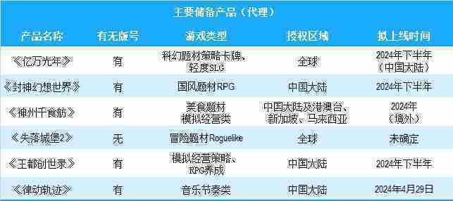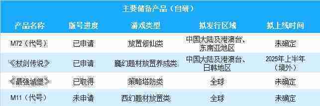 公司有多款储备产品,,涵盖放置类、、、、策略类、、、、RPG、、Roguelike等多元化游戏品类,,储备的主要自研和代理产品如下::::