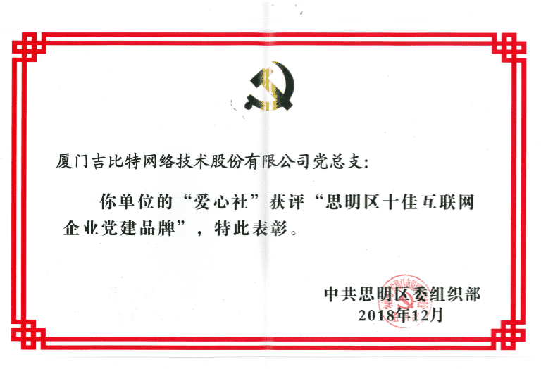 经初审评选、、网络评选和专家评审等环节,,"厦门赏金大对决网络技术股份有限公司党总支-爱心社" 从全区28个参评党建品牌中脱颖而出,,获评"思明区十佳互联网企业党建品牌"。。。