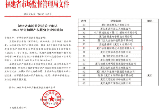 近日,,,,福建省市场监督管理局公示了2023年福建省知识产权优势企业名单,,厦门赏金大对决网络技术股份有限公司(以下简称“赏金大对决”或“公司”)榜上有名。。